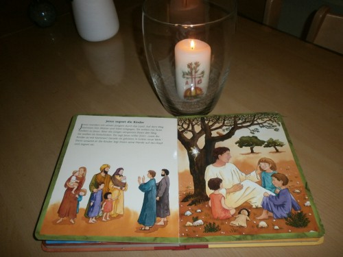 Auch während unserer Notbetreuung in der Coronazeit, verzichten wir nicht auf religiöse Impulse. Mit der altersgemischten Notgruppe, mit Kindern von 2-6 Jahren, haben wir einen Stillekreis gemacht und mit Teelichten (echte und LEDs) ein wunderschönes Bild kreiirt. Über Bildern die die Himmelfahrt Jesu zeigen, haben wir die Kinder erzählen lassen. Alle fanden die ruhige, konzentrierte Atmosphäre sehr schön.