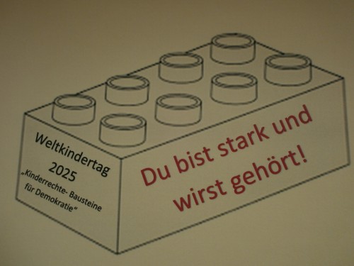 Schon letzte Woche hatten sich die Kinder und das pädagogische Personal, wie so oft, über die Kinderrechte unterhalten. Gestartet sind wir heute dann mit einem Kreis auf dem Bolzplatz mit dem Lied "Hallo, hallo, schön das du da bist". Nun wurde alles zusammengetragen, was die Kinder gemalt hatten. Auf große Bausteine wurden sowohl die Kinderrechte geschrieben, als auch die passenden Bilder der Kinder geklebt. In einem regen Austausch erzählten viele Kinder, was für sie ein wichtiges Recht ist. Zum Abschluss wurde noch das "Kindermutmachlied" gesungen und symbolisch ein Bild von einem Legostein mit dem diesjährigen Motto an jedes Kind verteilt.