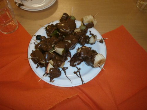 Am heutigen Tag haben wir in allen Gruppen das Ernte-Dank-Fest nachgefeiert. Alle Kindern hatten Obst und Gemüse mitgebracht, das in jeder Gruppe anders verwertet wurde. Die einen machten sich einen Obstsalat, andere einen Rohkostteller und einige tunkten ihr Obst sogar in Schokolade. Dazu wurden Herbst- und Erntelieder gesungen und an Gott gedacht, der uns das alles beschert hat.